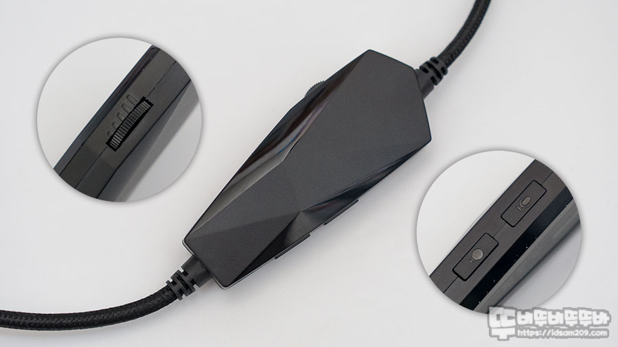 케이블 중앙에 위치한 인라인 컨트롤러는 볼륨 다이얼과 LED 효과 선택 그리고 마이크 On/Off를 선택할 수 있으며 케이블 굵기가 약 4mm로 튼튼한 편이라 컨트롤러가 더해져 약간에 무게감이 느껴질 수 있으니 참고하시고요.