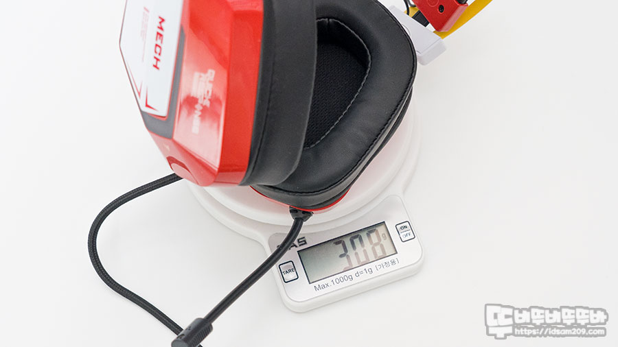 유선 헤드셋이라 무게 측정이 정확하진 않지만 1g 단위로 측정하는 디지털 저울로 무게 측정 시 약 308g으로 나오는데 아무래도 케이블이 바닥으로 늘어지면서 무게가 살짝 더 나온 느낌인데 스펙 정보의 무게가 270g, 케이블 포함 315g이니 엇비슷하게 나오는 거 같습니다.