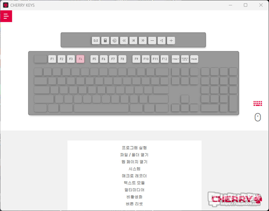 체리 홈페이지에서 다운로드가 가능한 Cherry Key 프로그램은 F1~F12 펑션열에 기능을 부여할 수 있는 기능을 제공하는데 텍스트 또는 키 입력 매크로를 지원하는 게 특징입니다.