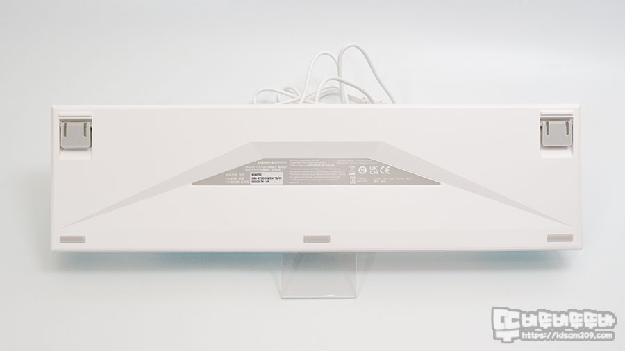 키보드 하판은 화이트 컬러 베이스에 그레이 컬러가 적용된 높이 조절다리와 미끄럼 방지 패드 그리고 제품의 시리얼 정보가 인쇄된 라벨 스티커를 확인할 수 있는데요.