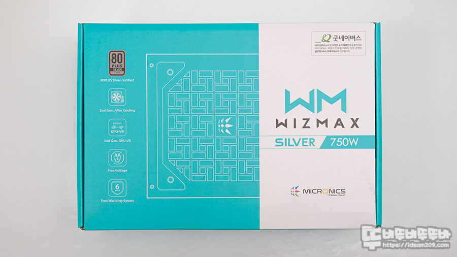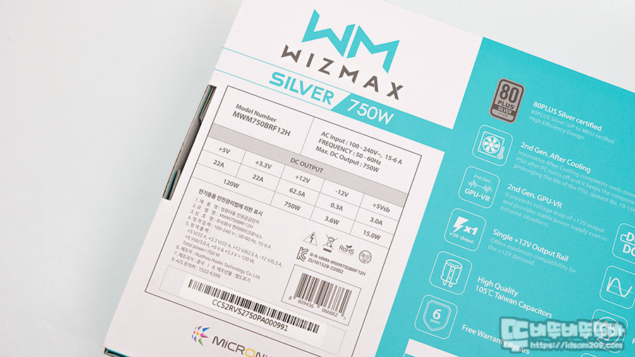 마이크로닉스 WIZMAX 750W 80PLUS SILVER 파워서플라이는 골드 등급을 인증받고도 실버 등급으로 판매하는 조금 독특한 모델로 2세대 애프터 쿨링과 2세대 GPU-VR, 보증기간 6년, 그리고 750W 출력임을 패키지 인쇄로 확인할 수 있습니다.
