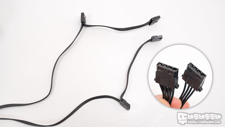 SATA 케이블은 450+150+150(±20)mm로 케이블당 3개의 커넥터 구성으로 2개의 케이블로 구성.
