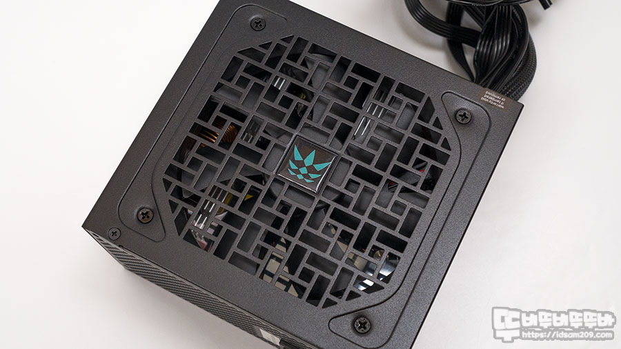 샤시 측면에는 제품의 모델명과 80 Plus 인증 등급, 브랜드 이름이 청록색 컬러의 실크인쇄로 각인되어 있어 눈에 확 띄네요.