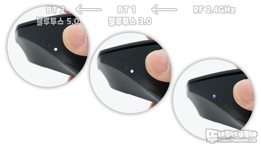 버튼을 선택했을 때 RF 2.4GHz, BT1(블루투스 3.0), BT2(블루투스 5.0) 순으로 연결방식을 선택할 수 있으며 LED 인디케이터로 연결상태를 확인할 수 있습니다.