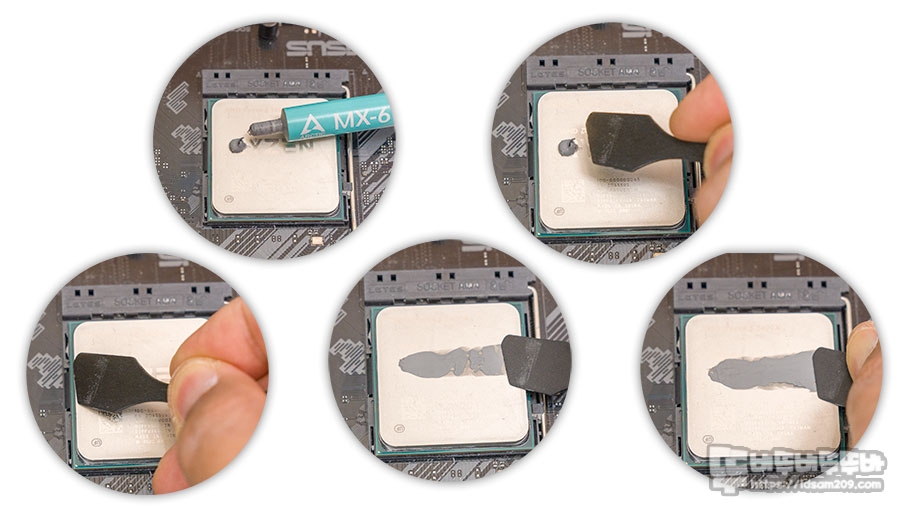 먼저 아틱 MX-6 써멀 컴파운드를 짠 후 스크래퍼로 힘을 적게 준 상태로 발라보면 한 번에 부드럽게 펴지지 않고 두 번째 힘을 주어 꾹 눌러 도포를 해야 발림성이 좋아지는 느낌을 주었고요.