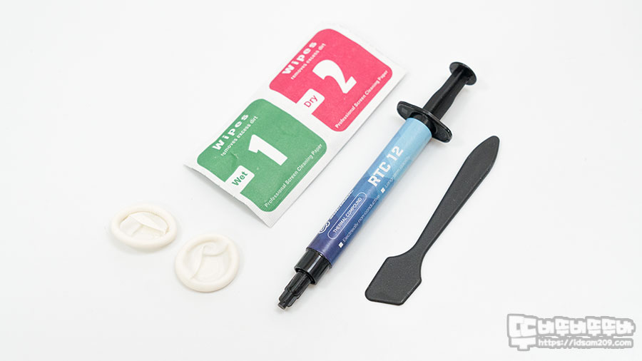 제품 구성은 써멀 컴파운드(써멀 구리스) 2g, 스크래퍼, 알코올 및 알코올 건조 페이퍼, 실리콘 손가락 장갑으로 구성되어 있습니다.