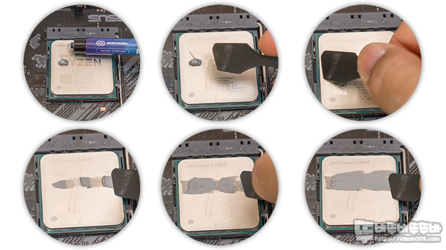 많이 사용하는 써멀 컴파운드의 점도를 테스트를 해보기 위해 RYZEN 로고에 R 글씨 크기만큼 짜고 스크래로 도포를 해 보았습니다.