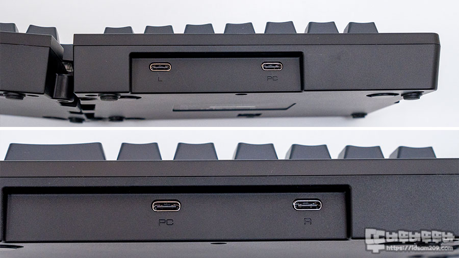 키보드 상단부분에 위치한 USB-C 연결 커넥터는 안쪽에는 좌우를 연결하는 단자, 바깥쪽은 PC와 연결하는 단자로 구성되어 있으며 이전 모델과 다르게 컨트롤러가 왼쪽 키보드에 내장되어 있는 게 특징입니다.