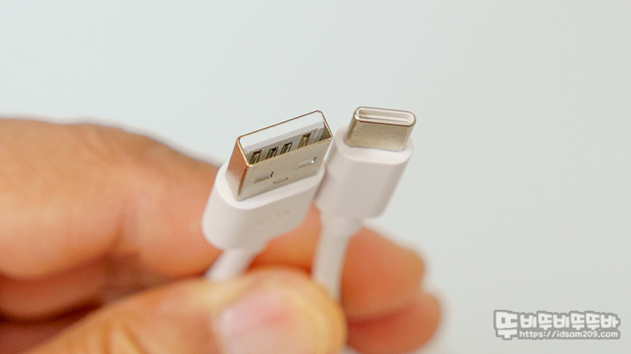 USB-C to A 유선 및 충전 겸용 케이블 모습과 RF 2.4GHz 무선 리시버 모습.
