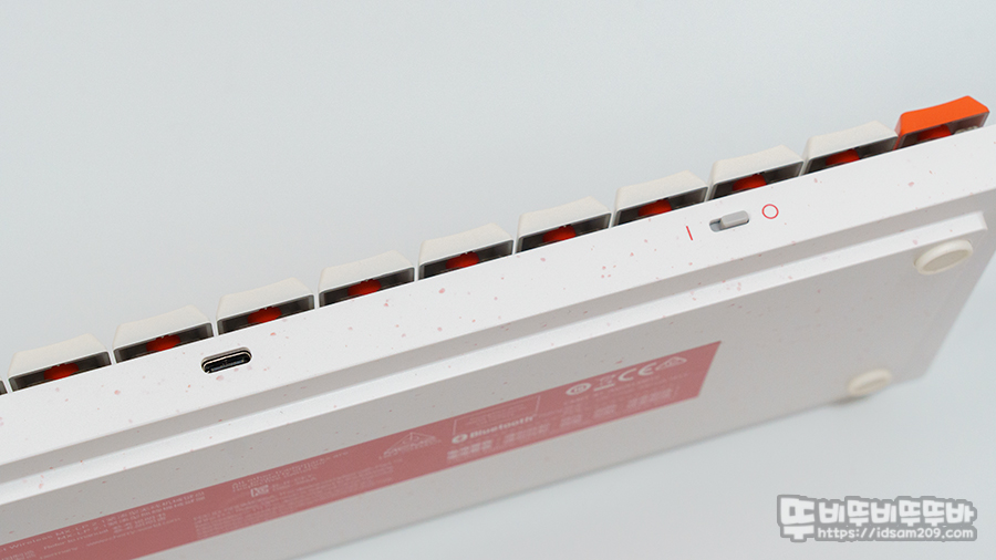키보드 전면에는 유선 케이블 연결 및 충전을 지원하는 USB-C 단자와 돌출된 스위치 디자인으로 전원 On/Off가 가능합니다.