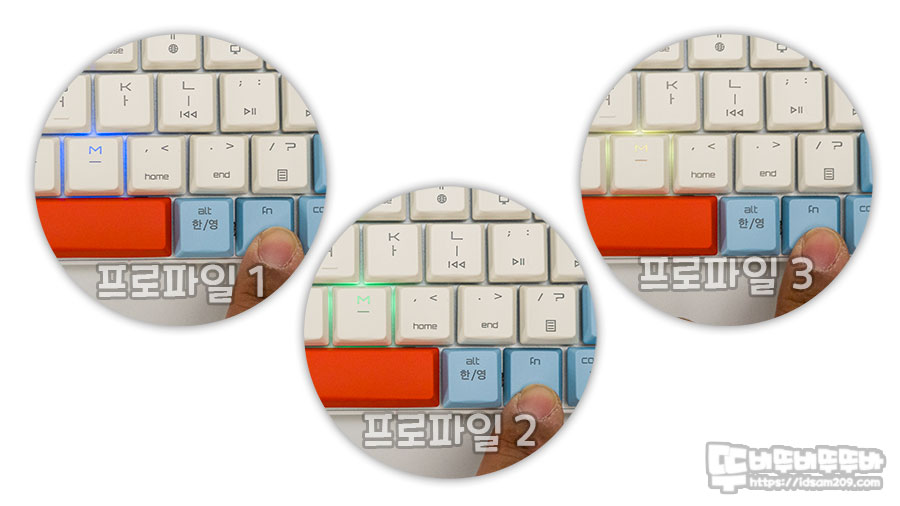 Fn + M 키를 눌렀을 때 프로파일 1: 파란색, 2: 녹색, 3: 노란색으로 표현되니 매크로를 특정 프로파일에 저장하여 필요할 때 프로파일을 변경하여 활용하시기 바랍니다.
