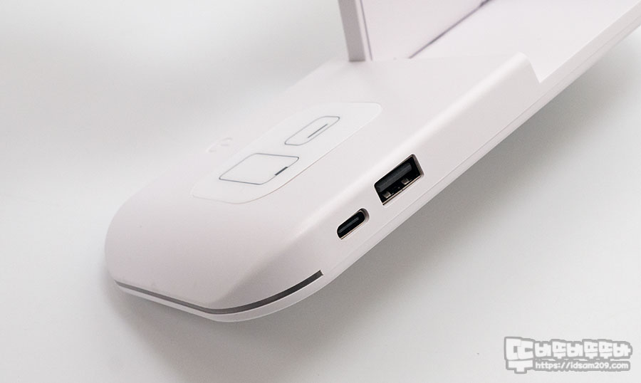 충전 베이스 뒷면에 위치한 USB-C 입력 단자와 USB-A 출력단자 모습.