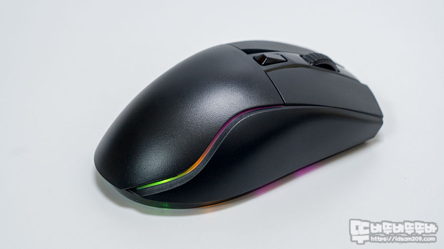LED를 표현하는 하우징 바닥면에 투명 소재가 사용되어 빛이 확산되는 느낌이 적은 부분은 아쉽지만 PBT 소재가 사용된 버튼의 뽀송뽀송함, 비대칭임에도 왼쪽 버튼이 높지 않아서 FPS 게임을 할 때 연속 클릭을 해보 검지 손가락에 부담이 없는 게 너무 좋았습니다.