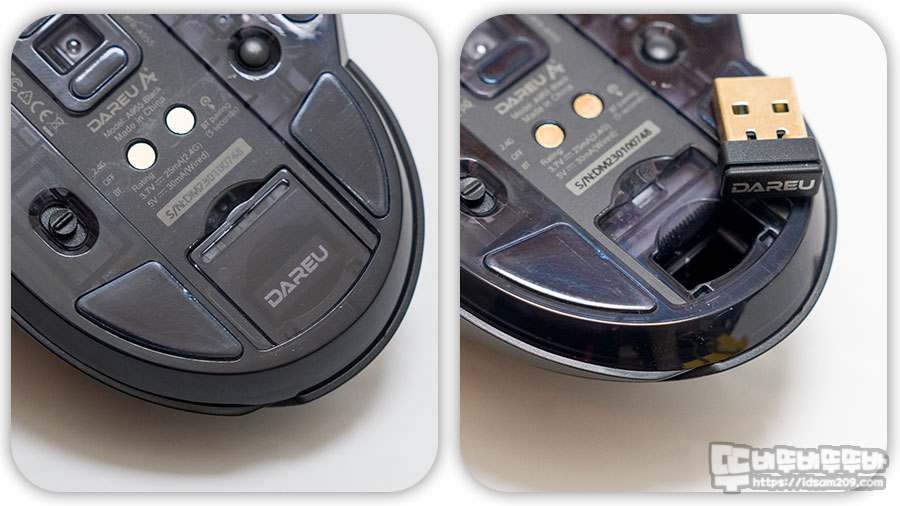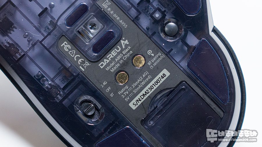 바닥면은 최근 출시된 다얼유의 무선 게이밍 마우스와 같이 왼쪽에는 2.4GHz, Bluetooth 연결방식 셀렉트 스위치, 무선 충전 금속 접점 그 옆에는 블루투스 페어링 버튼 모습을 확인할 수 있고요.