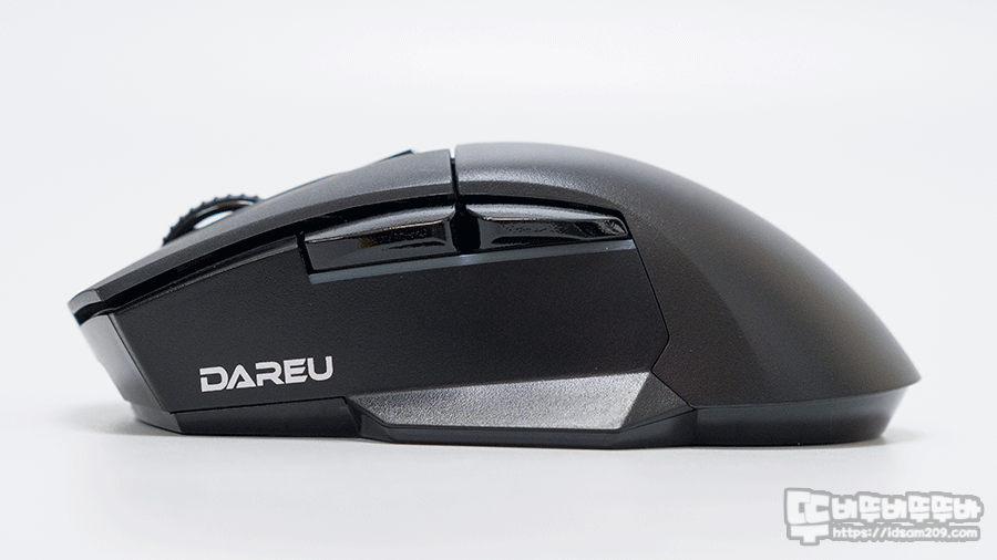 DAREU 다얼유 A955 무선 게이밍 마우스는 오른손 전용 비대칭 디자인에 버튼 부분에 PBT 소재, 나머지 하우징은 ABS 소재, 바닥면은 투명 소재를 사용한 게 특징입니다.