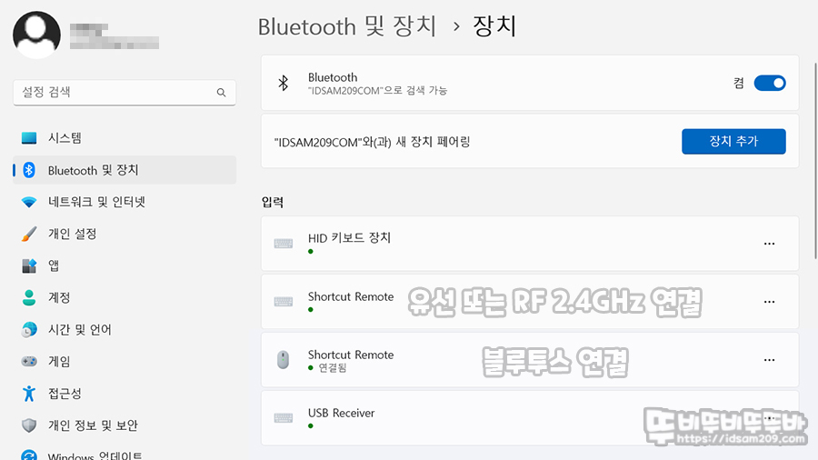 RF 2.4GHz 무선 리시버를 PC에 연결하고 XP-Pen ACK05 측면의 전원 버튼을 위로 올려 전원 On이 되면 RF 무선으로 연결이 되며, 블루투스의 경우 전원 On 이후 K1 버튼을 눌러주면 LED 인디케이터가 빠르게 점멸하는데 PC의 장치 메뉴에서 블루투스 "Shortcut Remote"를 선택해 주면 사용이 가능합니다.