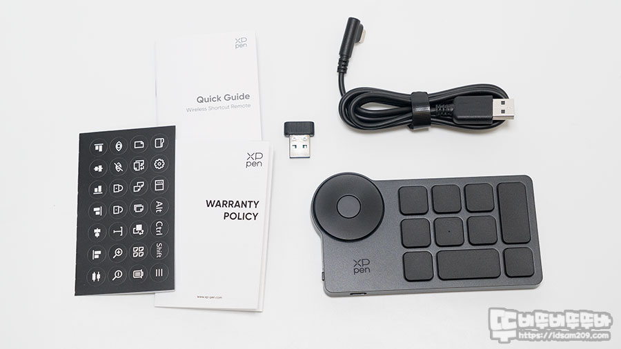 제품은 무선 타블렛 키보드 본체, USB A to C L타입 헤드 케이블, RF 무선 수신기, 퀵 가이드, 무상 보증 /드라이브 다운로드 안내서, 단축키 스티커로 구성되어 있습니다.