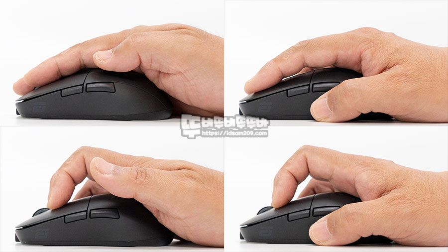 마우스 하우징의 엉덩이 부분이 볼록하게 디자인되어 상대적으로 버튼 부분이 낮기에 손가락을 펴서 사용하는 팜 그립보다는 손가을 세워서 사용하는 클로그립이 편안함을 줍니다.
