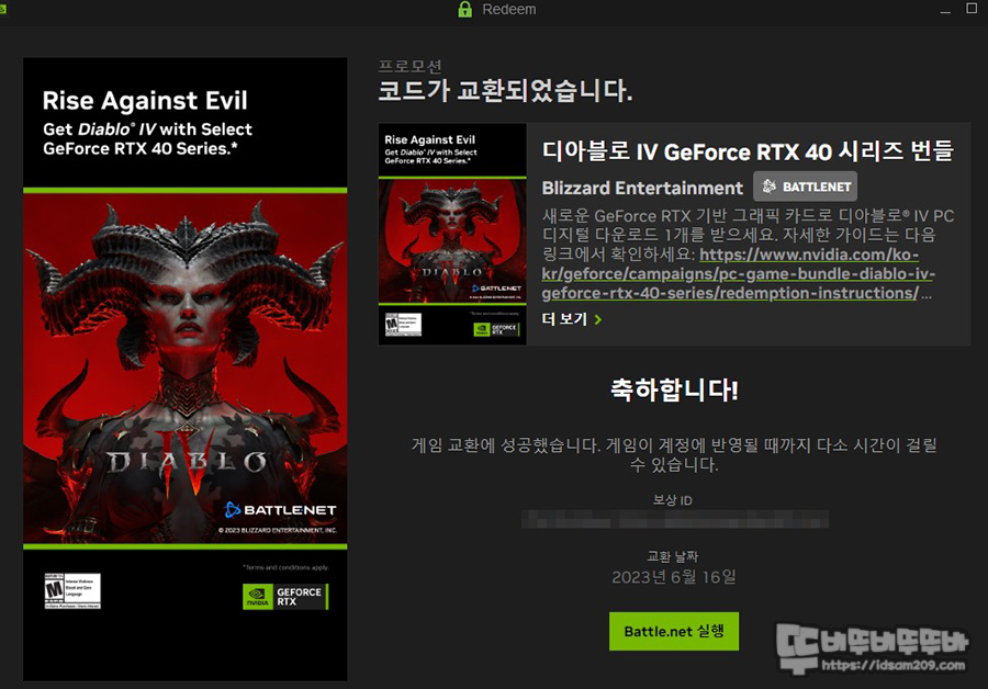ZOTAC RTX 4070 그래픽 카드를 구입하고 제공받은 쿠폰 교환 코드를 이용하여 디아블로 4 다운로드를 하기 위해 이벤트 페이지에서 알려준 NVIDIA GeForce Experience 로그인 → ID를 클릭해서 나오는 사용 클릭 → 리딤 코드 입력 → 블리자드 베틀넷 로그인 → 교환버튼 클릭 순으로 진행하였는데.....