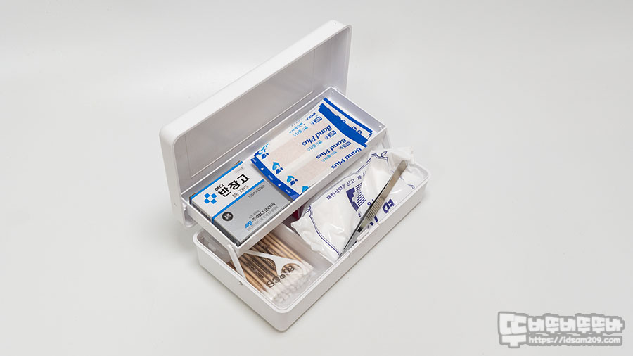 2단으로 구성된 케이스에는 다양한 비상 약품과 용품으로 구성되어 있습니다.