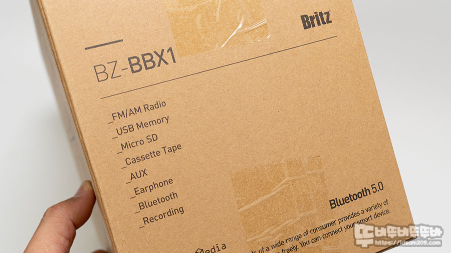 브리츠 카세트 라디오 올인원 붐박스 블루투스 스피커 BZ-BBX1 패키지는 무지 박스에 심플하게 인쇄된 게 특징이며