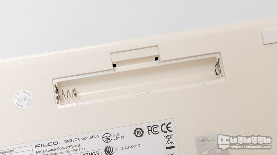 키보드 바닥면을 살펴보면 위/아래에 두툼한 미끄럼 방지 패드 모습과 높이 조절 다리, 무선 On/Off 스위치, 키보드 키 위치를 변경하는 DIP 스위치, 건전지 소켓을 확인할 수 있는데요.
