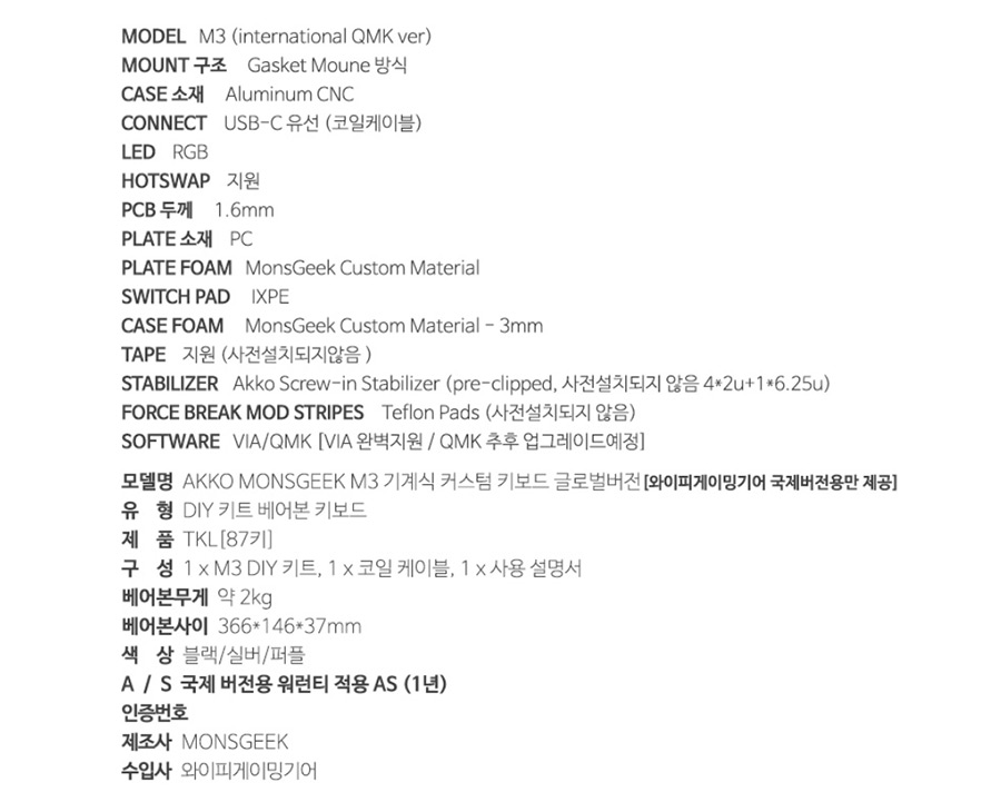 공식수입사인 "와이피게이밍기어"에서 수입하여 판매하는 M 시리지는 International (국제버전) 버전으로 QMK와 VIA를 지원하지 않는 중국 내수용 제품과 다른 게 특징인데요.
