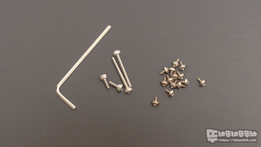 하우징 채결에 사용하는 L 육각랜치와 여분의 하우징 결합용 나사 그리고 스테빌라이저 고정용 나사 모습.