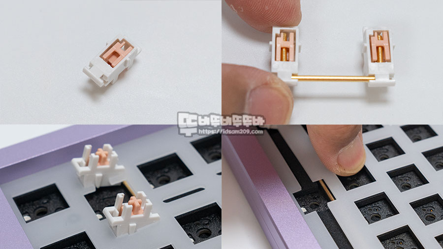 스위치 윤활처럼 스테빌라이저 스탬(용두) 옆면에 윤활을 하는 경우 윤활제가 많이 도포가 되면 스위치를 눌렀을 때 올라오지 않거나 먹먹한 키감을 느낄 수 있는 만큼 스탬부분의 윤활은 초심자가 하기엔 실패확률이 높은 만큼 신중하시는 게 좋습니다.