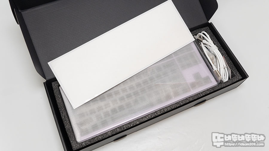 제품은 MONSGEEK M3 베어본 본체, 투명 블리스터 커버, USB-C to A 케이블, 사용 설명서, 보강판용 스테빌라이저 세트, 여분의 가스킷 실리콘, 그리고 여분의 나사로 구성되어 있습니다.