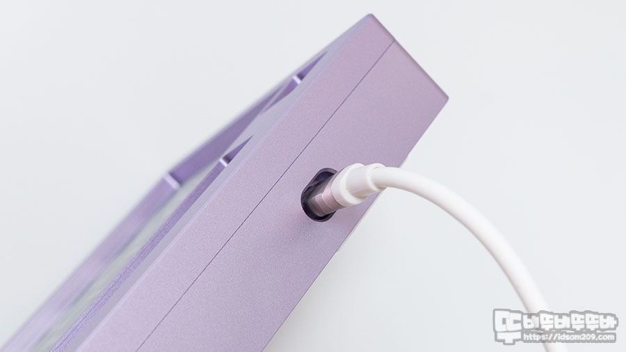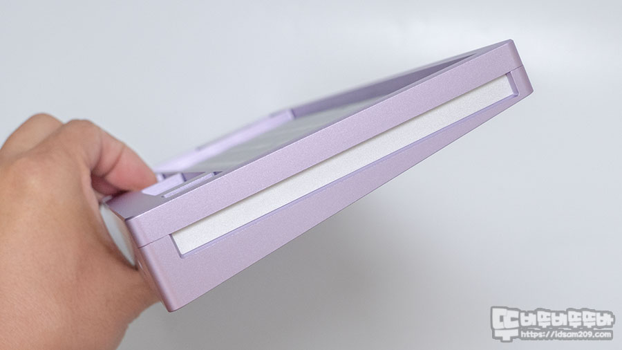 측면의 CNC로 가공된 하판의 측면을 가려주는 실버 컬러의 알루미늄 가이드가 눈에 띄는데 투톤 느낌으로 퍼플컬러와 구분이 되어 투톤느낌을 줍니다.