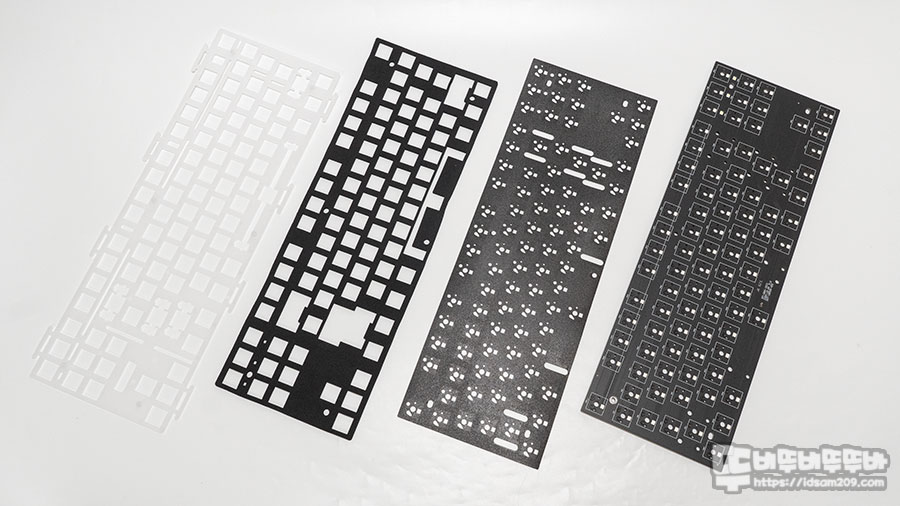 폴리카보네이트 보강판과 커스텀 플레이트 폼, 스위치 패드, 기판 모습인데요.