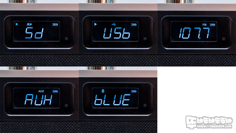 실제 사용을 해보니 기능 버튼의 경우 대부분 짧게 또는 길게 누르는 형태로 2가지 기능을 가지고 있으며 그중에 전원 버튼 (Standby)은 길게 눌러 전원 On/Off, 짧게 눌러 스탠바이 형태로 유지되는데 전원 On 이후에 전원 버튼을 짧게 한 번 더 누르면 재생 모드로 SD/USB/FM 라디오/AUX/ 블루투스 모드 기능을 선택할 수 있습니다.