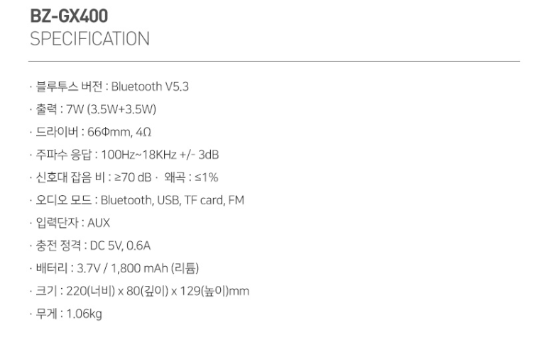 브리츠 BZ-GX400는 66mm 드라이버 유닛 2개와 전면 에어덕트 구조로 7W 출력이 강력하게 들려주며 블루투스 / FM 라디오 / 시계 / SD + USB MP3 재생 / AUX 입력 등 다양한 기능을 탑재한 올인원 제품으로 실내 또는 야외에서 편리하게 사용할 수 있는 휴대용 블루투스 스피커인데요.