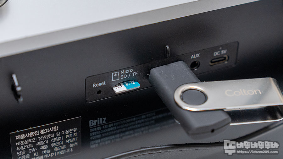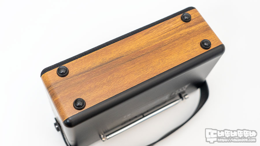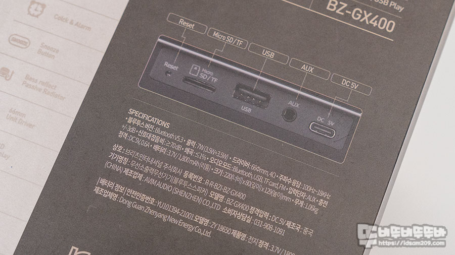제품의 뒷면에는 텔레스코픽 FM 라디오 안테나 이외 리셋 버튼, MicroSD(TF Card) 메모리 슬롯, USB-A 단자, AUX (3.5mm) 단자, USB-C (DC 5V) 단자로 구성되어 있습니다.