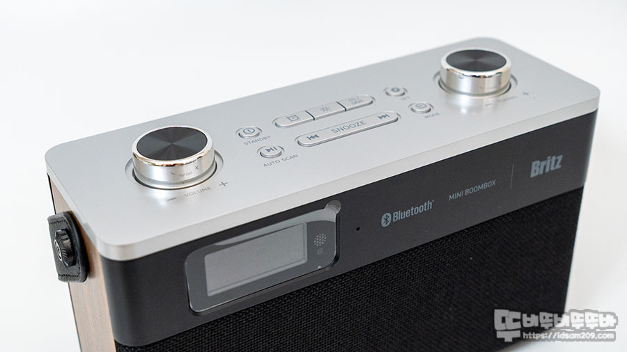 제품의 상단부분은 은색으로 도색 처리된 메탈 느낌의 깔끔함이 돋보이는데 볼륨과 FM 라디오 채널을 선택을 담당하는 노브와 컨트롤 버튼이 위치하고 있는데요.