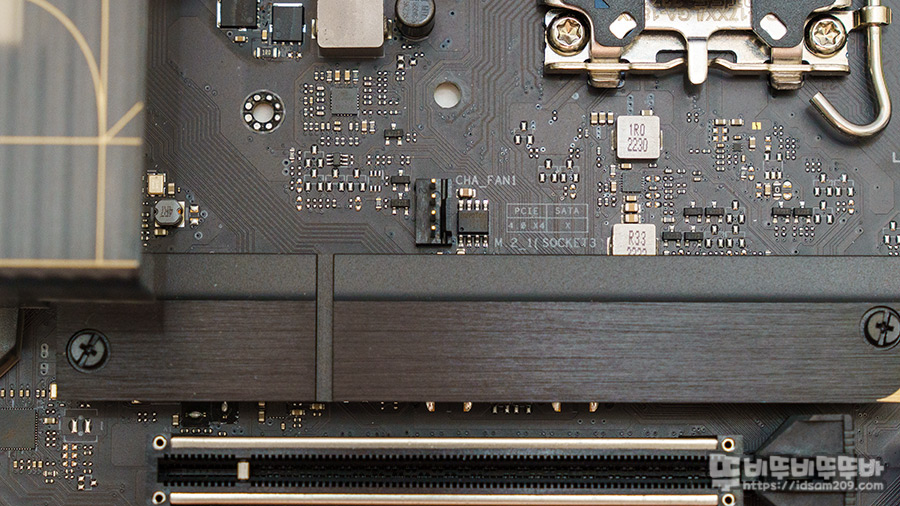 메인보드 위쪽에 CPU 쿨링팬 관련 CPU_FAN, CPU_OPT, AIO_PUMP 소켓 모습을 확인할 수 있는데 AIO_PUMP 소켓은 워터자켓이 장착되는 CPU 소켓 아래쪽에 위치했으면 하는 아쉬움이 있네요.