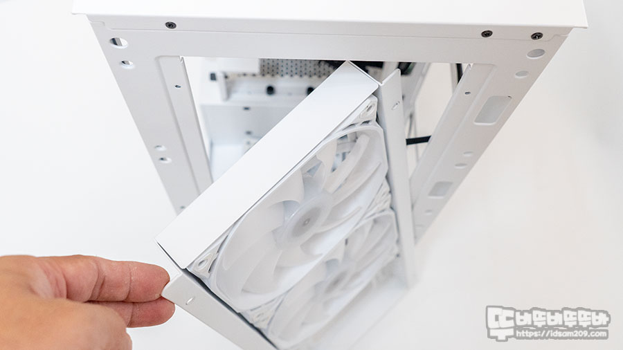 철재 커버를 분리 후 전면의 쿨링팬 가이드를 제거가 가능하여 120/140mm 쿨링팬 3개 또는 240/280/360mm 수랭쿨러 장착을 쿨링팬 - 쿨링팬 가이드 - 라디에이터 순의 샌드위치 방식으로 장착하게 됩니다.