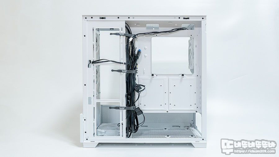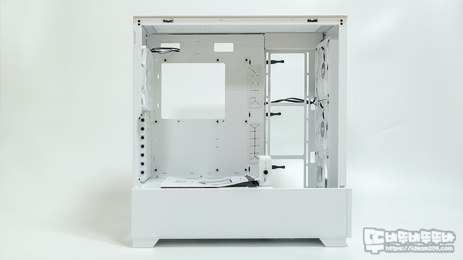 특히 앞쪽 부분의 수랭쿨러 및 쿨링팬 장착 부분과 메인보드가 장착되는 내부 샤시 부분이 ㄱ자로 형태로 꺾여있어 파워 케이블 정리하는 상당히 유용했습니다.