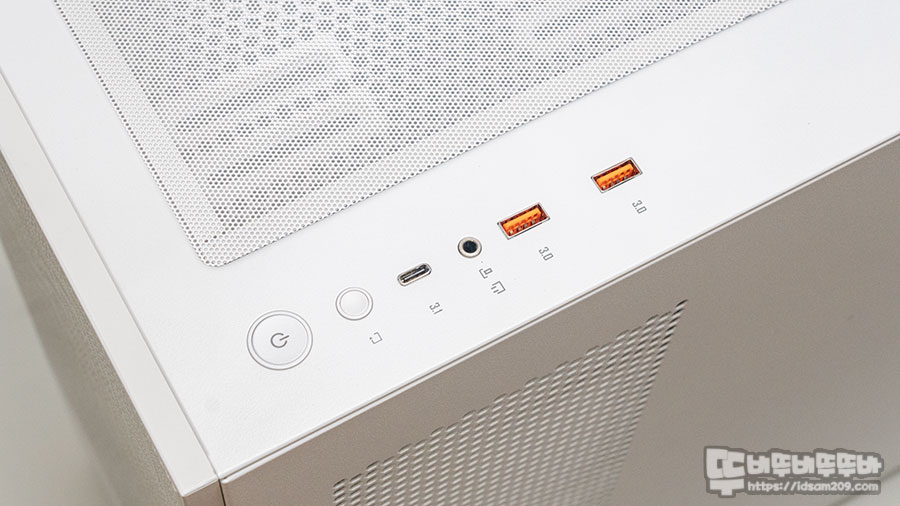 측면에 부착된 I/O 포트는 시스템 조립 시 I/O 포트 케이블이 케이스 내부를 통하지 않고 뒷면에서 정리가 가능하기 편리하며 포트 구성은 전원 버튼 / RGB LED 버튼 / USB 3.1 / 4극 HD AUDIO 단자 / USB 3.0 단자 2개로 구성되어 있습니다.