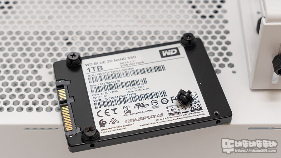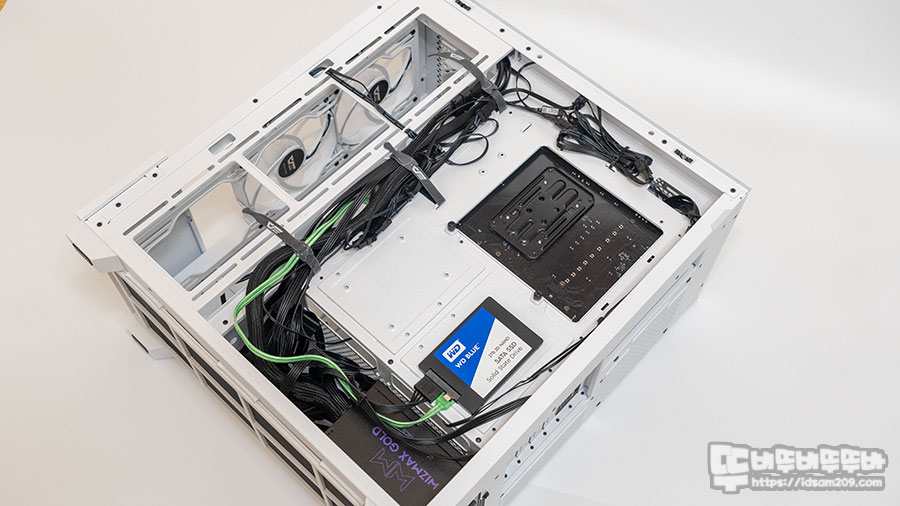 저장 장치는 파워서플라이 장착 전면부 샤시에 2.5" SSD 전용 장착 공간과 메인보드 샤시 뒤쪽에 SSD/HDD 겸용 브라켓 2개를 사용할 수 있습니다.