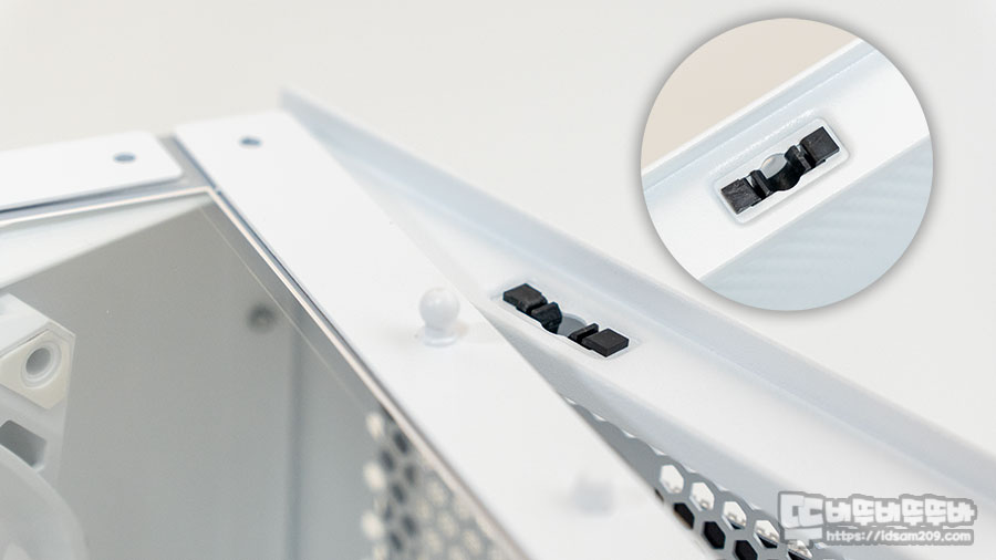 강화유리 패널 아래의 하단 사이드 패널은 리벳이나 용접 형태가 아닌 나사를 이용한 탈부착이 가능한 방식으로 하단 사이드 패널을 제거 시 하단의 쿨링팬과 SSD 장착이 용이합니다.