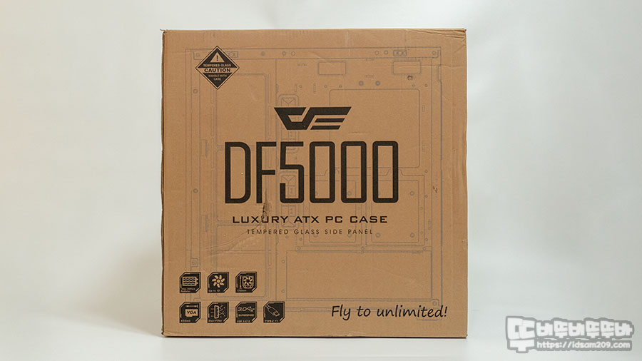 다크플래쉬 DF5000 패키지에는 제품의 모델명과 포인트 특징이 아이콘으로 인쇄되어 있으며 럭셔리 ATX PC 케이스임을 강조하고 있습니다.