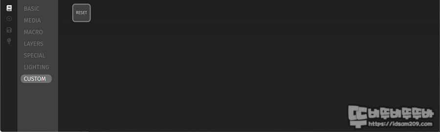 키보드 자판 기능을 부여할 수 있는 KeyMap에는 기본, 미디어, 매크로, 레이어, 스페셜, 라이팅, 커스텀 순으로 각 항목에 해당하는 내용들을 확인할 수 있습니다.