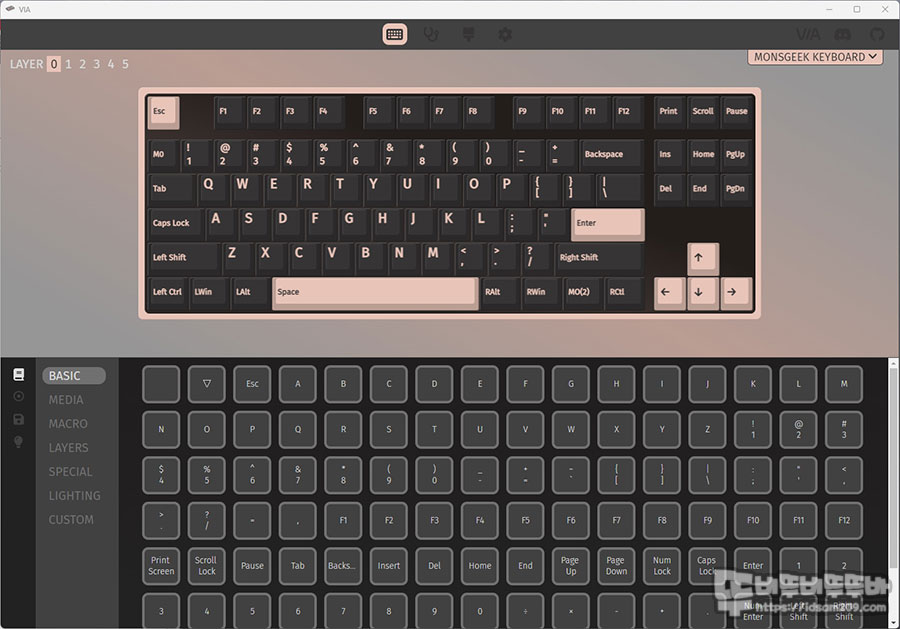 VIA 프로그램을 구동하면 자동으로 MONSGEEK 키보드를 인식하고 연결된 제품의 키배열을 보여줍니다.