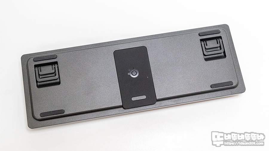 키보드 상단 부에는 스틸시리즈 로고와 키보드 자판을 정면으로 보았을 때 왼쪽에 위치하는 USB-C 단자를 확인할 수 있네요.