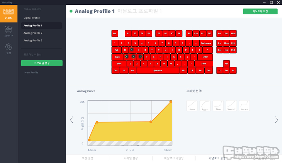 우팅 One 당시에는 플레어텍 옵티컬 스위치를 사용했던 시기라 커브 형태의 아날로그 키 반응과 4단계 키 바인딩으로 보다 직관적인 설정이 가능했어지만 자석 방식의 스위치를 사용하는 우팅 Two, 60he에서는 바뀌었을 거라 판단되네요.