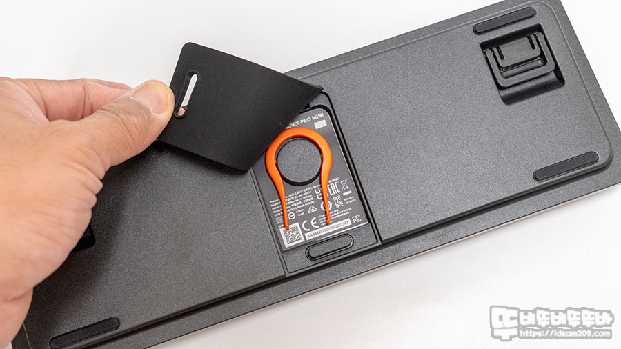 바닥면에는 기본적인 미끄럼 방지 패드를 확인할 수 있으며 중앙 부분에 실리콘 커버를 오픈하면 키캡 리무버가 들어있는 것을 확인할 수 있습니다.
