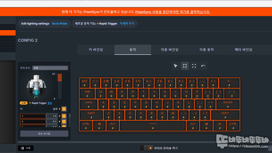 동작 메뉴에서는 키에 대한 반응값을 0.1~4mm로 선택이 가능하며 여기에 Rapid Trigger 부분을 체크하여 번개표시를 활성화해 주면 됩니다.
