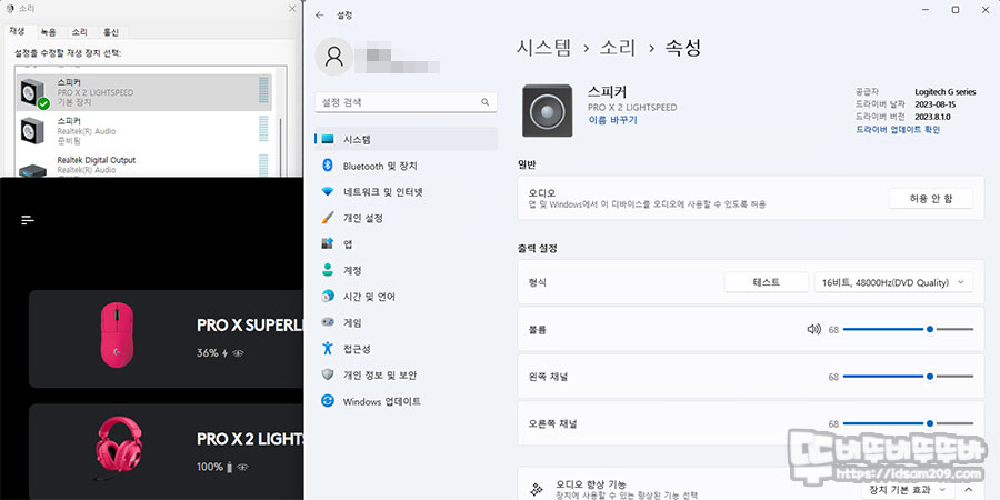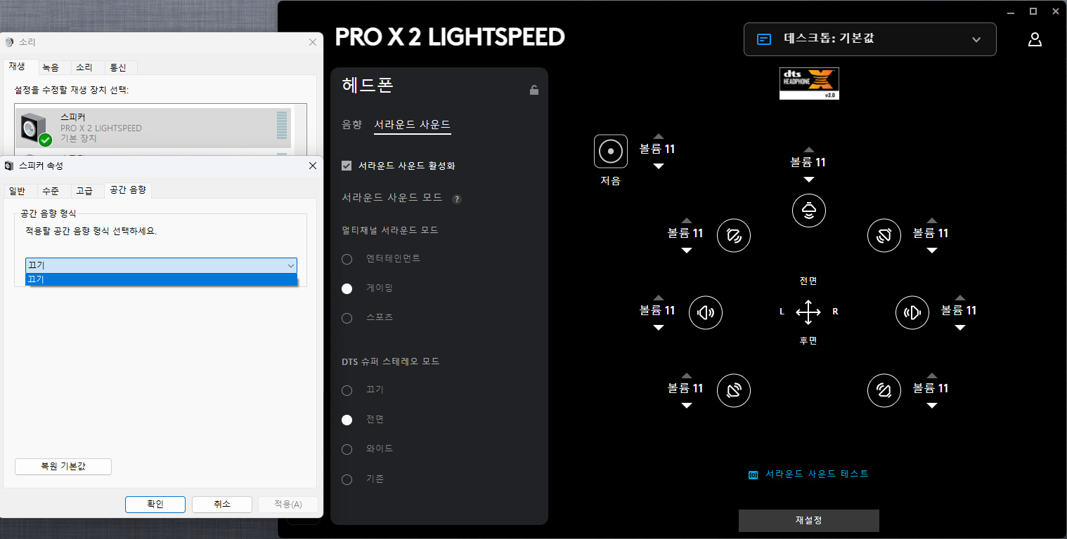조금 독특한 부분이라면 보통의 무선 헤드셋 제품을 사용할 때 이용할 수 있는 윈도우즈 - 소리 항목의 공간 음향 선택 부분이 비활성화되며 G-Hub 내의 서라운드 사운드만 사용이 가능하니 참고하시기 바랍니다.